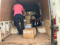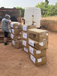 3 fietsen, 6 matrassen, 2 rolstoelen, materiaal ivm familiale planning en 23 dozen met kledij, dekens, lakens,.... zijn via de zee aangekomen in Ouagadougou.