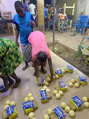 Françoise verdeeld alles netjes: 3 bollen zeep, 1 blok gewone zeep en een zakje waspoeder. Voor de grote meisjes is er ook een doosje maandverband bij.