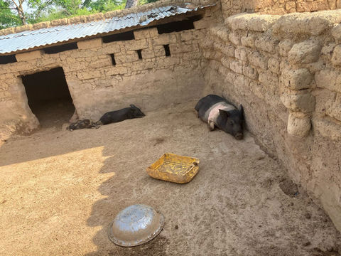 We kochten de boerderij omdat de kinderen van het internaat in Bobo-Dioulasso er tijdens de schoolvakanties zouden kunnen gaan werken. Het betreft een kleine boerderij met enkele varkens en biggetjes, kippen en konijnen.